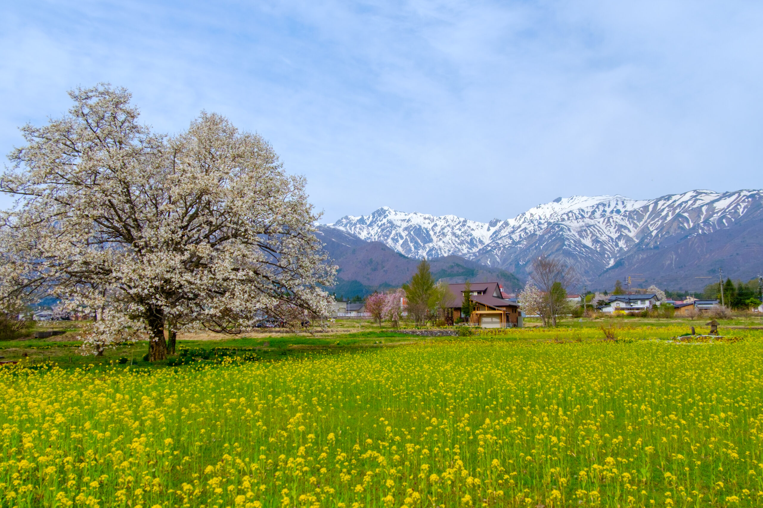 桜が終わると、木々に新芽が出てきて山が鮮やかなグリーンになり残雪のアルプスと綺麗な景色を見せてくれます。あと、姫川源流では白い小さな花のニリンソウが一面綺麗に咲き、田んぼではGWぐらいから代掻きが始まり5月には田植えが始まります。