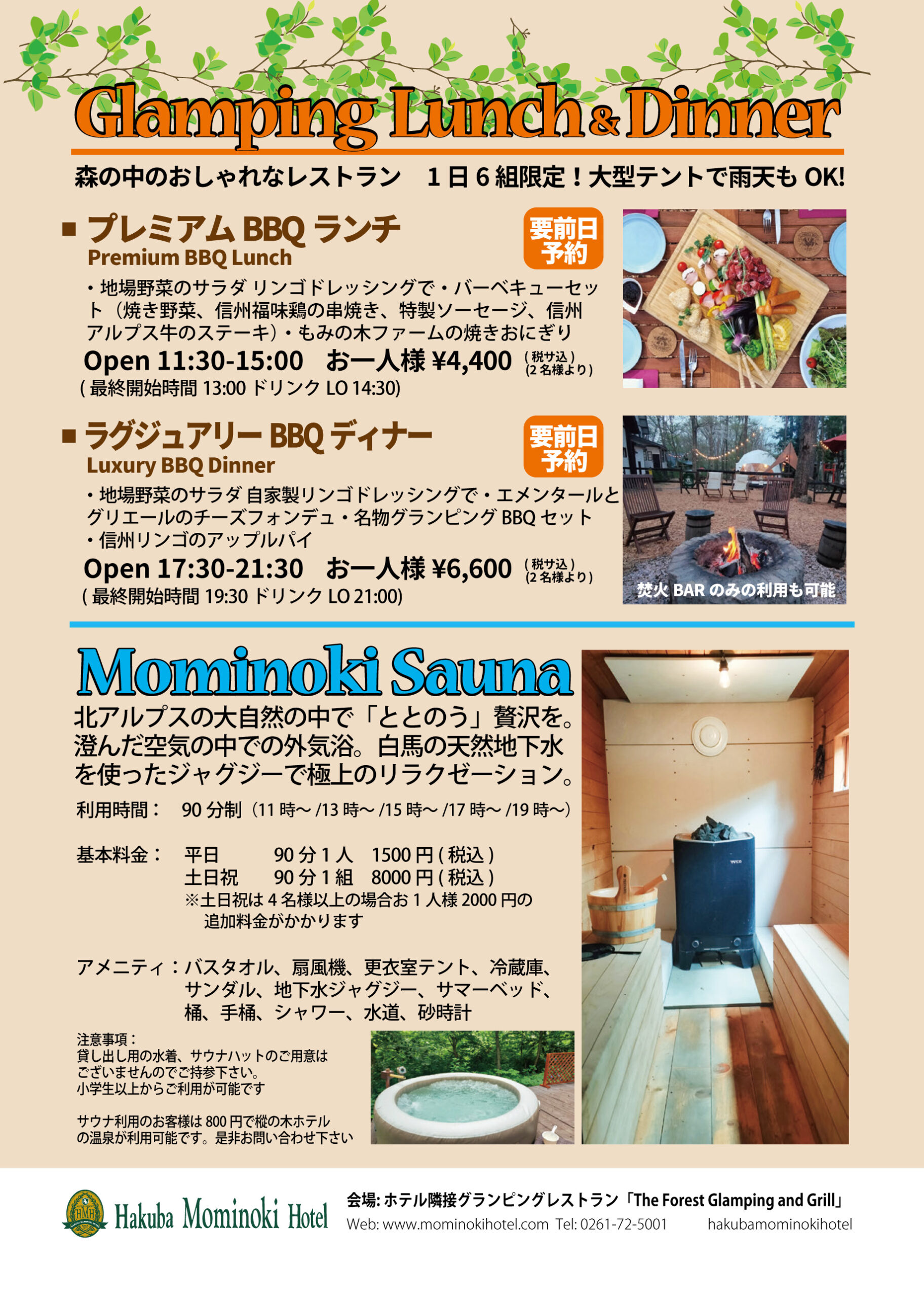 この夏新たにグランピングエリアにプライベートサウナが登場! また、レストランテラスでは豪華ビュッフェに飲み放題とBBQがついたプランも登場! さらに、期間限定でラウンジで各種クラフトビールやカクテルやワインなど楽しめます!